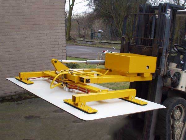 Fork Mounted Vacuum Lifting Attachment is an equipment used to lift and move objects with smooth, non-marring surfaces such as glass, tiles, plastic sheets, and many fragile materials. It is designed to be attached to the forks of a forklift truck or any heavy-duty lifting machinery that can hold the weight of the load.